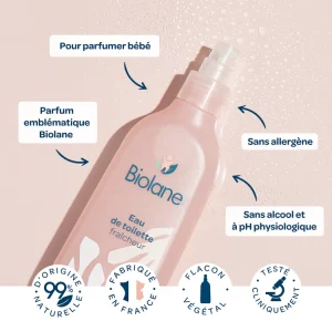 L’eau de toilette fraîcheur Biolane complète agréablement la toilette et rafraîchit votre bébé à tout moment de la journée.